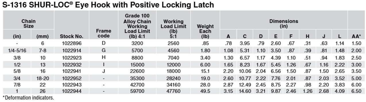 Crafted from Grade 100 alloy steel to provide strength and durability for your lifting tasks. With a Working Load Limit of 59,700 lbs., this hook is engineered to handle substantial loads. The 1" trade size provides versatility, making it compatible with a wide range of rigging setups and equipment.
